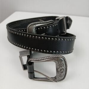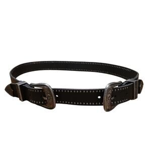 Add some western-inspired flair to your look with this American Eagle double buckle belt. Crafted in genuine black leather with antique silver western-style buckles, it’s the perfect accessory to elevate jeans, dresses, or skirts. Adjustable for a comfortable fit and built to last.