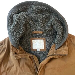 AE American Eagle Sherpa Lined Hooded Brown Canvas Workwear Jacket, Chore Coat.
