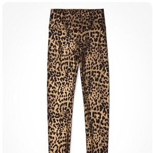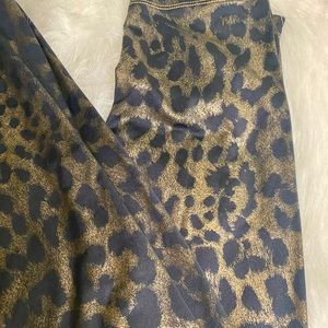 American Eagle Shine Leopard Print High Waisted Leggings. These have a shiny, metallic feel to them on the outside. They do have stretch, and are super comfy. Perfect with a black sweater or tee over the top!