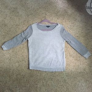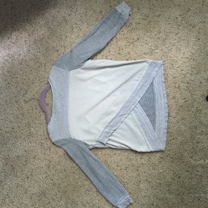 Quarter sleeved, sweater texture, grey on the front and tan/off white on the back. The back opens up to make an open back.