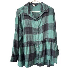 American Eagle Shirt Size Medium Button Up Long Sleeve Peplum Green Black Preppy
