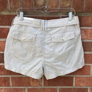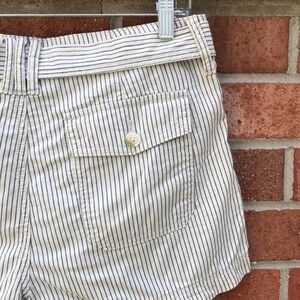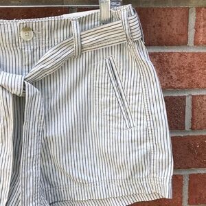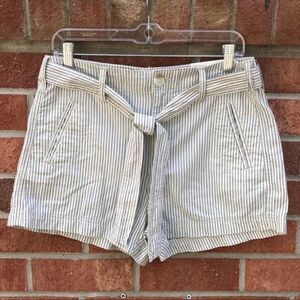 American Eagle Outfitters Cotton Striped Tie Waist Shorts, sz 8, NWT, Off White/cream with navy stripes, zip fly with tie waist, front & back pockets, Virtual Model is wearing a generated idea of item. Please refer to pictures of actual item.