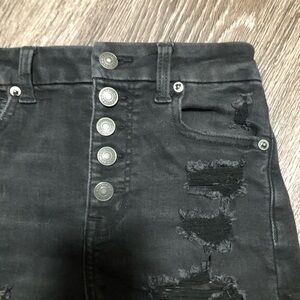 American Eagle, denim shorts, high-waisted, distressed, black shorts, size 00, button fly, next level stretch, edgy, casual, summer, women's shorts, pre-owned, excellent condition