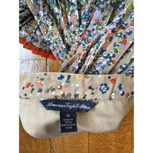 This American Eagle mini skirt in size 10 features a pleated chiffon floral print design, making it a stylish addition to any woman's wardrobe. The skirt is fully lined for added comfort and has a mid-rise waist. The multicolor floral pattern adds a touch of femininity, perfect for casual occasions during any season. Made of polyester, this skirt is machine washable for easy care. The American Eagle brand ensures quality and style that will stand out in any outfit.