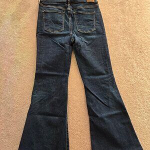 Size 12 American Eagle Super Hi-Rise Flare Denim Jeans in Dark Rich Indigo, 4 real pockets and even a small one for change. In great condition!