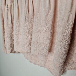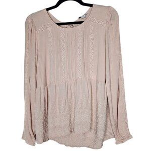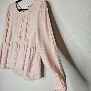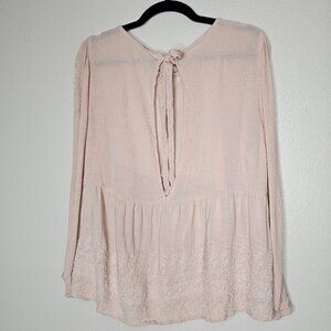 Light pink gauzy long sleeve top with crochet lace and floral embroidery. Elastic wrist. Ties at the back of the neck with large cut out.
