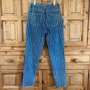 Features: Very cute pair of denim jeans. Vertical striped. Button and zipper closure. Pockets at the front and back. Mom jeans.