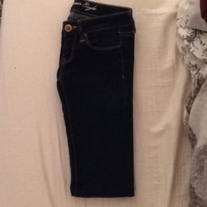 American Eagle dark wash skinny jean. 00 Regular. No marks, stains or tears. Good condition. Wash color not faded. My favorite pair of jeans, too small for me.