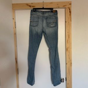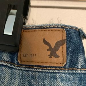 These distressed America Eagle Jeans are so cute on. They are a Xtra long length so length is for tall.I am 5 ft 11in and can roll up the ends still. Only wore once on my honeymoon.