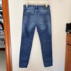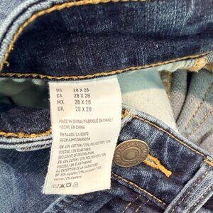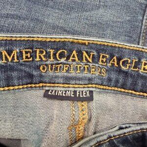 Extreme flex skinny jeans, size 28x28 (equivalent to standard size 6/8). Brown stitching on back pockets.
