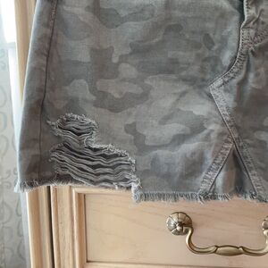 American Eagle distressed camo denim jean skirt. Perfect condition, frayed hem, light camo colors in size 0