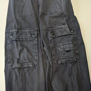 First, a reminder that American Eagle notoriously runs large, so please see measurements. These are a great pair of trousers for a casual affair, or for any outdoor adventure. The pockets can't be beat, 2 big leg pockets secured by buttoned flaps, and a baby pocket is attached to one of them, for something small that you don't want lost among the other items. High-waisted, adjustable drawstring ankles, and standard zip/button fly. Two more patch pockets with button flaps on back, and regular pockets on front. If you like to fish or hike, these are the absolute best pants for the comfort, pocket space, and durable fabric.