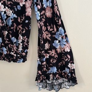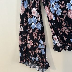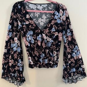 Like new condition! AE soft & sexy long flare sleeves. Black with blue, rust, white colored flowers. Gathered at waist with elastic band. V neckline. Size S