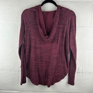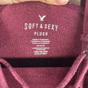 This American Eagle Soft & Sexy hooded top in maroon heather features a lace-up neckline and lightweight, ultra-soft fabric, giving it a relaxed Y2K-inspired vibe. The long sleeves and hooded design make it perfect for casual everyday wear, layering over tanks, or styling with jeans for an effortless throwback look.