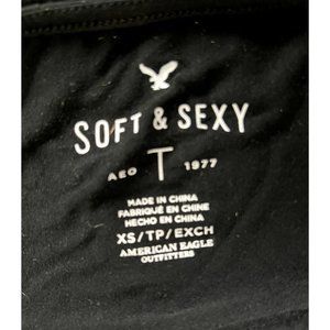 This American Eagle Soft & Sexy black T-shirt in size XS offers an elegant draped front and a flattering deep v-neck. The long sleeves add a touch of sophistication to this must-have wardrobe staple.