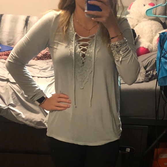 This is an American Eagle shirt from their soft and sexy collection in a size small. It has a flower lace detail on the front and then a string lace up design. It is in a light blue color but also is slightly green almost like a soft seafoam, shown in picture. Let me know if you have any questions and feel free to send me an offer. Bundle for a discount!