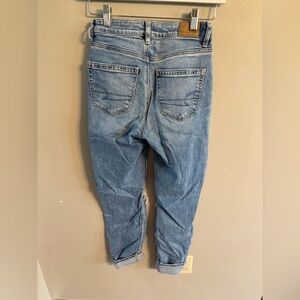 Trendy medium blue jeans with ripped knees. Relaxed boyfriend fit. Ideal for everyday style.
