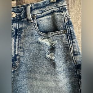Curvy high rise mom jeans. Light distressing on front pockets. Minimal distressing on back pockets. Straight leg look. Lightly worn.