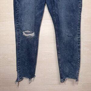 Keywords: American Eagle jeans, mom fit denim, high rise jeans, distressed denim, raw hem, stretch jeans, 90s style