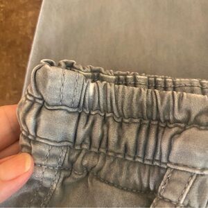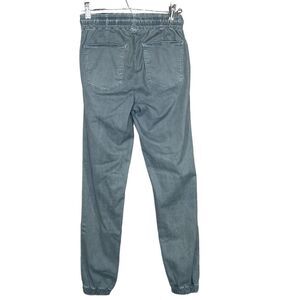 Jogger style denim with drawstring waist, deep side pockets and back pockets, and tapered leg with elastic cuff.