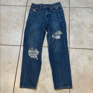 Gently worn American Eagle Stretch Mom Straight Jeans women's size 4. Stretch denim, high rise waist, five pocket styling, zipper fit, mom fit with relaxed straight leg, destroyed, light distressing on hems. Offers accepted!