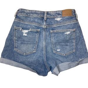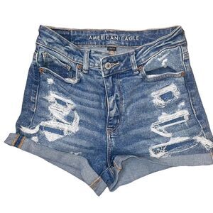 American Eagle denim shorts, distressed jean shorts, ripped denim shorts, rolled cuff shorts, high rise blue jean shorts, stretchy denim shorts, casual summer shorts, medium wash denim, women’s cutoff shorts, American Eagle Outfitters shorts