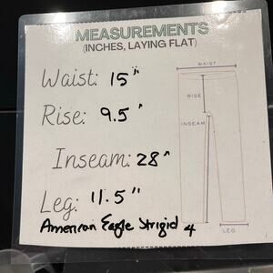 In excellent preowned condition with no flaws: no tears, wear, stains or smell. Comes from smoke free home. Size 4. Measurements laid flat: waist 15”; hip 20”; inseam 28”; front rise 9.5”; back rise 14”; leg opening 11.5”.