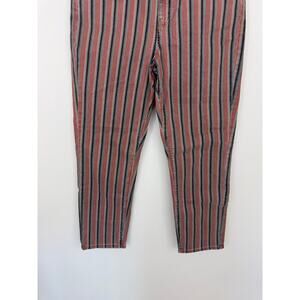 These high-rise jeans feature a rust and blue striped pattern with cropped leg fit and stretch comfort.
