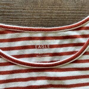 This American Eagle striped shirt is super cute with its brick red and off white stripes. It fits nicely without being too tight and is lightweight and breathable. The shirt can be enjoyed throughout the summer and winter with it neutral colors.