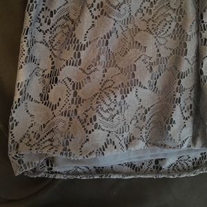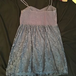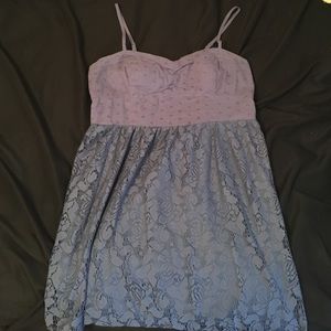 This flirty, flowy dress features a textured polka dot pattern on the bodice and a girly floral lace pattern on the skirt of the dress. This dress looks great alone or paired with a cardigan and tights to make it a great transition piece.