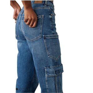 These American Eagle Super High Rise Baggy Straight Cargo Jeans offer a trendy, comfortable fit with multiple pockets and a stylish mid wash. Ideal for a casual, fashion-forward look.