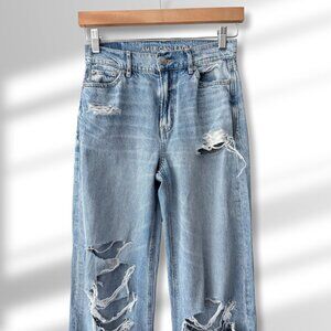 American Eagle jeans, AE denim, ripped jeans, destroyed jeans, distressed denim, wide leg jeans, relaxed fit jeans, soft denim, light wash jeans, women’s size 000 short, vintage style, casual, comfy, lived-in denim, Y2K style