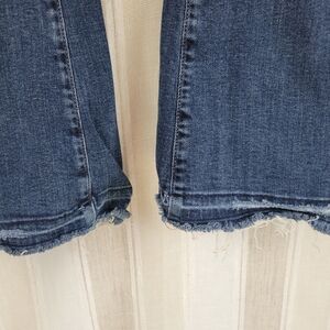 Excellent condition, dark blue wash, busted knees distressing, flared bootcut denim pants.