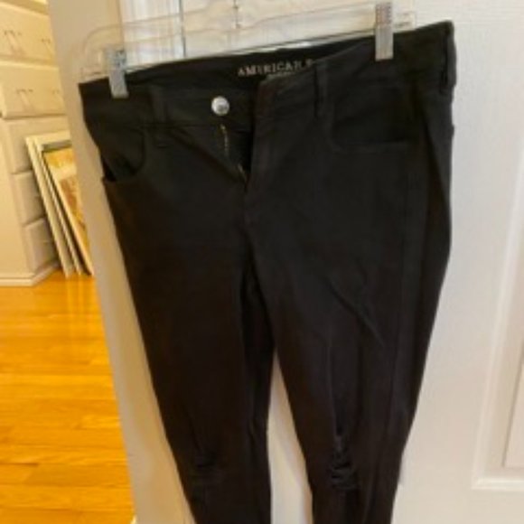 Black ripped skinny jeans from the Super Stretch X line at American Eagle. Extremely comfortable and stretchy with distressing at both knees. Regular US size 8.