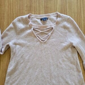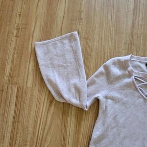 American Eagle Womens sweater size medium. Light pink, soft cozy knit, v neck, criss cross at neckline, bell sleeves. In excellent preowned condition.