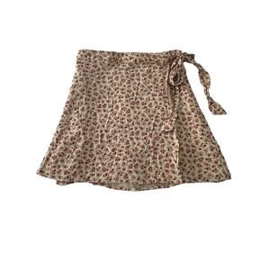 Gently Used in Excellent condition American Eagle side tie, wrap skirt. Tan with flowers. Size XS. 100% Viscose shell and 100% Polyester Lining. Length approx. 15 1/2"