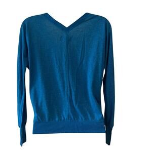 Teal blue (hard to photograph) with silver metallic striped knit top has v-neck, long sleeves and ribbed bottom band
