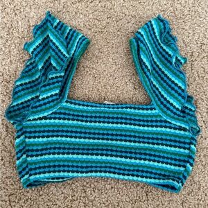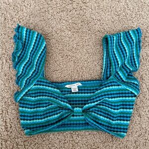 Chic teal striped bikini from American Eagle. Features a stylish top with cap sleeves