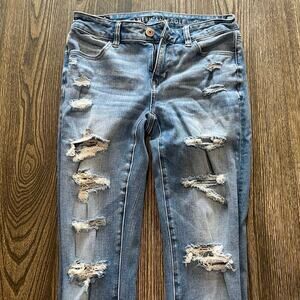 American Eagle The Dream Skinny Jeans Distressed High Rise Raw Hem Blue Size 2