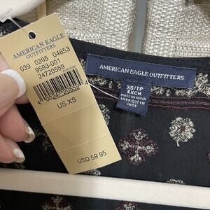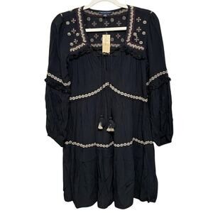 American Eagle Tiered Peasant Dress Size XS Black Embroidered Tassels Boho NEW