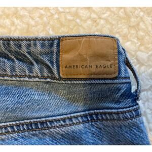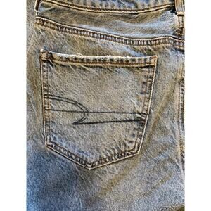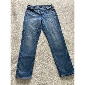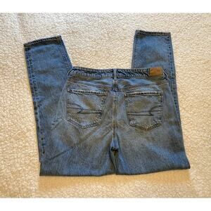 American Eagle Tomgirl low rise button closure straight leg denim jean, size 8 long, medium wash, 100% cotton, very good preowned condition, distressed on front of one leg and hip, Tomgirl jeans are low rise with a relaxed but tapered leg that's comfortable and loose without being overly baggy, they are known for soft fabric and slouchy 10" rise that sits low on hips and cropped tapered ankle, good option for those who want a relaxed fit without an ultra-wide ankle