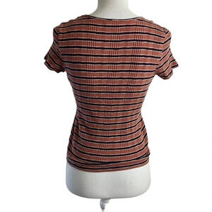 American Eagle Top Small Striped Button Accents Orange Navy Knit Short Sleeves