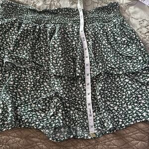 Green and white flowers on the skirt. Has 2 layers of ruffles and has elastic waistband. In great used condition. No flaws or damage to note.