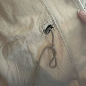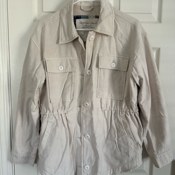 This stylish American Eagle utility jacket is perfect for layering in any season. Features a button-up front, two chest pockets, adjustable waist for a flattering fit, and a slightly frayed hem for a casual, worn-in look.