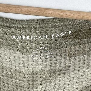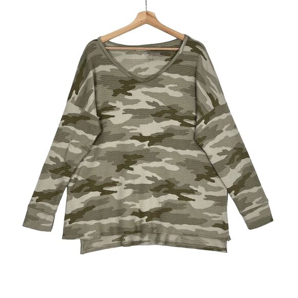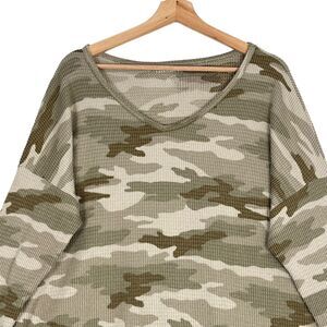 American Eagle V Neck Sweater Sz L Side Slits Camo Olive Green Waffle Knit Boho