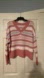 Cozy striped V-neck sweater in pink and cream tones. Hits me at the waist.