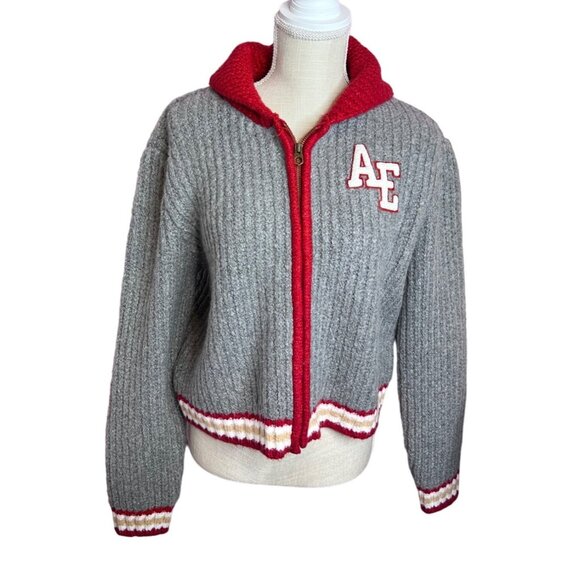 Stay cozy and stylish with this grey ribbed knit sweater. Features a bold red trim, zip-up closure, and AE logo with shawl collar. Thick knit, soft and cozy! Ideal for cooler days.