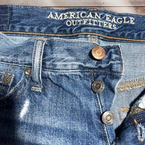 Excellet condition shorts from American Eagle Outfitters! Medium wash with patterned pockets that poke throught the fraying. Button fly and factory distressing and whiskering. Size 6, true to size with 3 inch inseam. No rips, stains, or tears. No cosmetic damage.