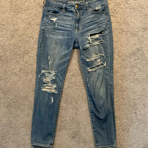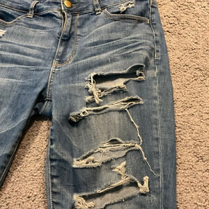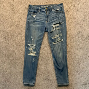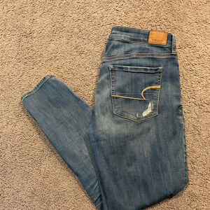 American Eagle Super Stretch Vintage High Rise JEGGING Distressed Denim Jeans Pants Y2K sz 12 S, excellent condition, recent style, a vintage look with a modern flair, great casual back to school jeans. Great Christmas gift Will ship right away. Check out my other American Eagle jeans consolidation