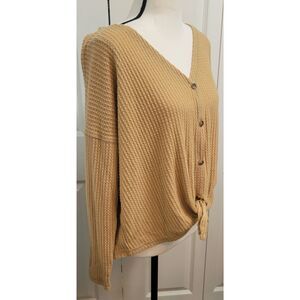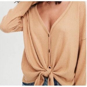 American Eagle AEO Waffle Knit Button Down Long Sleeve Tie Front Top Sz M in Tan, Slight mustard yellow hue